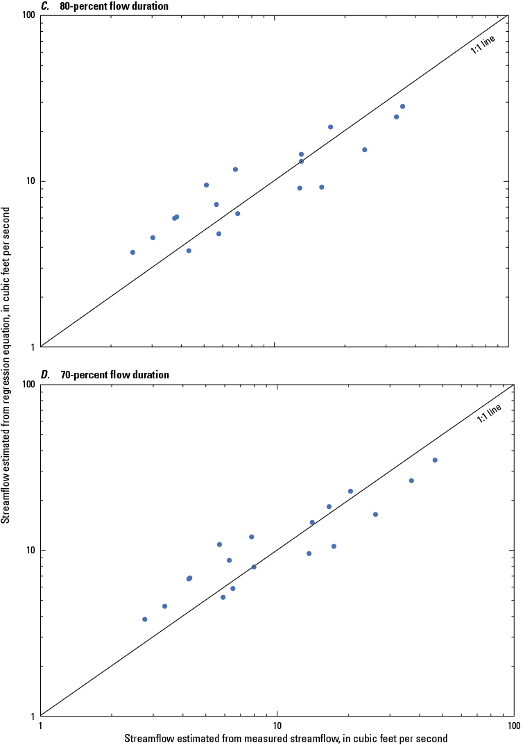 The USGS Hydrologic Toolbox software was used to compute flow durations (Barlow and others, 2022). The selected flow durations range from 99 to 1 percent (table 2), with the number of selected durations increasing in the extreme percentile ranges (from 99 to 90 and from 10 to 1). Estimated flow statistics at the 174 streamgages in the study for their periods of record are available in Bent and others (2025).