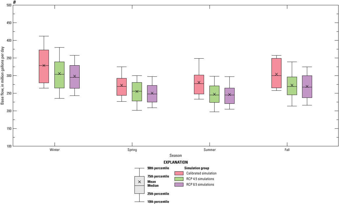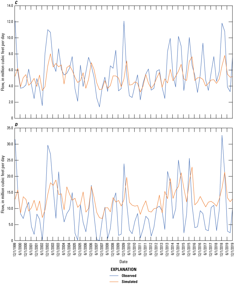 The MODFLOW model was developed using a temporal discretization of quarterly time intervals for model stress periods. Model stress periods were based on seasonal recharge and base flow data. The seasonal recharge data were grouped by the meteorological seasons, that reflect the annual temperature cycle: winter (December–February), spring (March–May), summer (June–August), and fall (September–November). Groundwater recharge input data from the SWB model (Antolino and Gurley, 2022) began in 1981, and base flow estimates for the four USGS streamgage sites have 22–39 years of record through 2019 (U.S. Geological Survey, 2022). Publicly available annual groundwater-use data were utilized in the model beginning in 2002. The first MODFLOW stress period was simulated as a steady-state system to represent long-term average conditions in the regional groundwater-flow system. This simulation established initial conditions using a broader distribution of observations across the model area and served as a baseline for the following transient simulation periods. The subsequent 82 transient stress periods, spanning winter 1999–2000 to winter 2019–20, are each 3 months long and coincide with the meteorological seasons, except for the final stress period, which represents an incomplete season, spanning only the month of December 2019. Each stress period was subdivided into three time steps to improve model stability and resolution for simulating groundwater response to transient conditions. The transient simulation captures seasonal recharge, stream base flow, and groundwater withdrawals.