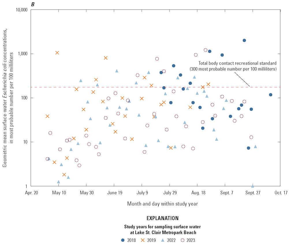 Graphs showing daily Escherichia coli concentrations, in most probable number per 100 milliliters, for (A) individual surface-water samples and (B) daily geometric means by year at Lake St. Clair Metropark Beach in Macomb County, Michigan, plotted against the month and day of the year for the 2018, 2019, 2022, and 2023 recreational seasons.