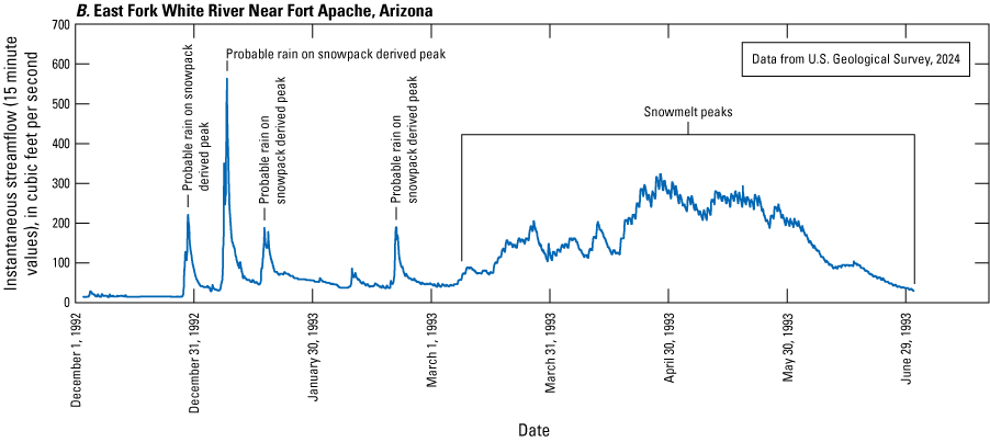 The USGS has operated several streamgages on the Fort Apache Reservation. Data from these streamgages are available from the USGS National Water Information System (NWIS) database (U.S. Geological Survey, 2024).