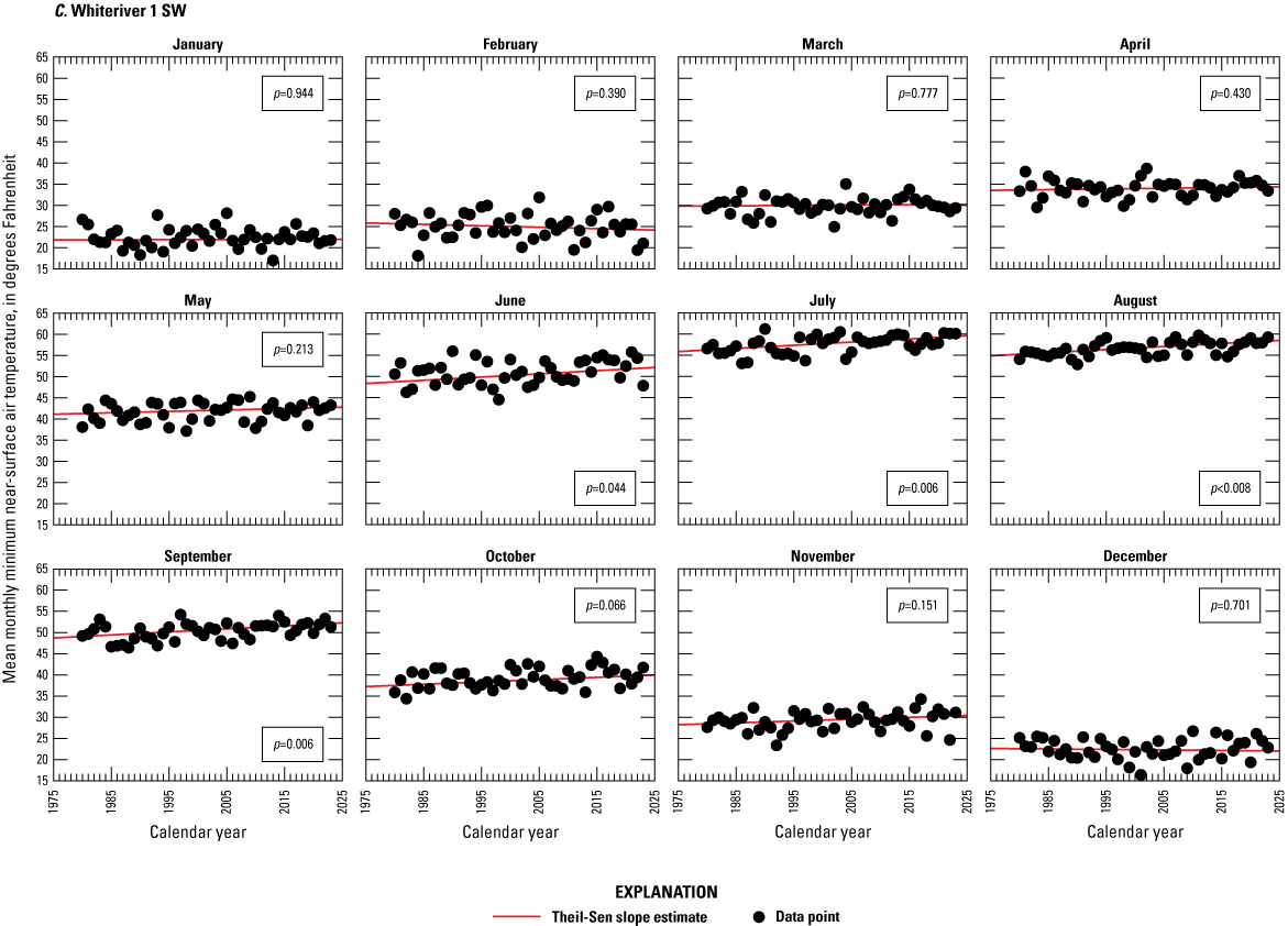The adjusted monthly temperature record from Whiteriver 1 SW was used to test for trends in the average monthly mean, maximum, and minimum, near-surface air temperature at the station using a Mann-Kendall test. The Theil-Sen slope estimate was used to compute the average change in temperature between the record’s beginning and ending periods. In addition, the average monthly mean, maximum, and minimum near-surface air temperatures for each year were used to analyze trends in the average annual mean, maximum, and minimum near-surface air temperatures.