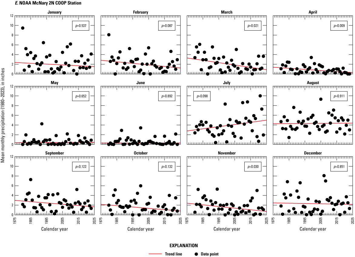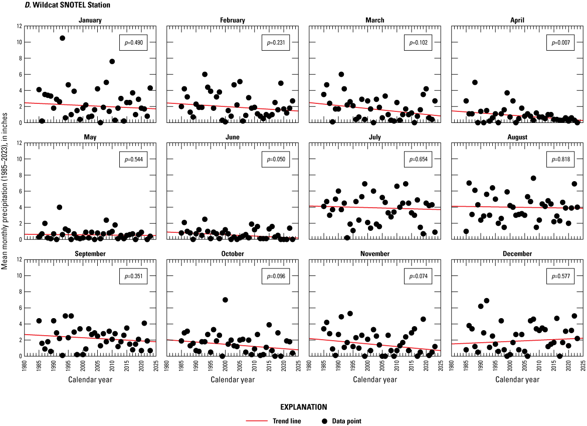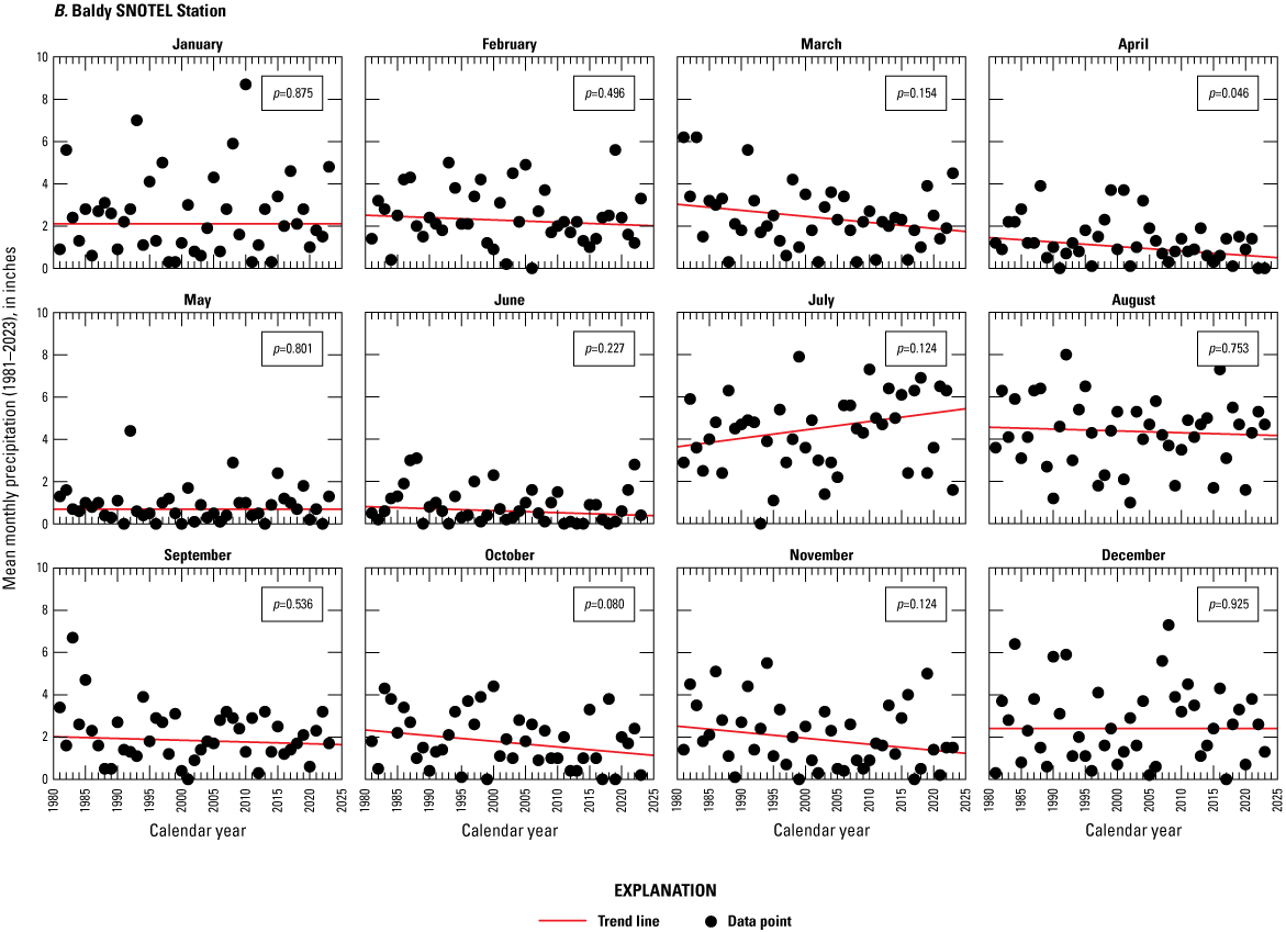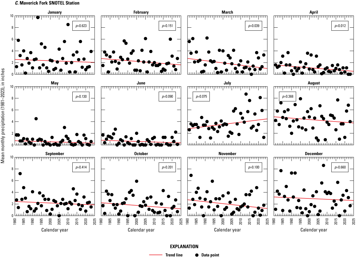 Trend analyses were done on the monthly and total annual precipitation recorded at Baldy 310, Maverick Fork 617, and Wildcat 866. At a SNOTEL station, the annual accumulated precipitation consists of the rain and snow (also known as SWE) that have entered the precipitation gage. Precipitation data were obtained from the NRCS Air and Water Database Report Generator (NRCS, 2024a, b, c5253). The precipitation increment element from the database was used for the analyses. Another option would have been to use the precipitation increment snow-adjusted element, but this element was not used for the analyses because it contained more derived data (Lexi Landers, NRCS National Water and Climate Center, written commun., 2024). The snow-adjusted precipitation increment adjusts the precipitation increment using the observed SWE data to account for potential undercatch by the precipitation gage. However, factors such as wind redistribution could affect the SWE sensor and inflate the snow-adjusted increment. A Mann-Kendall test was used to assess whether trends existed for the annual and monthly precipitation through the period of record. The Theil-Sen slope estimate was used to compute the average change between the record’s beginning and ending years.