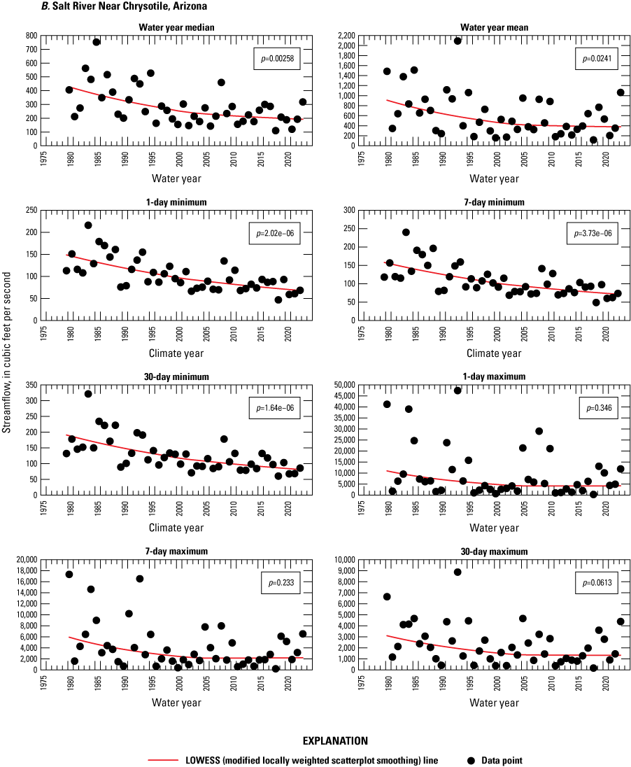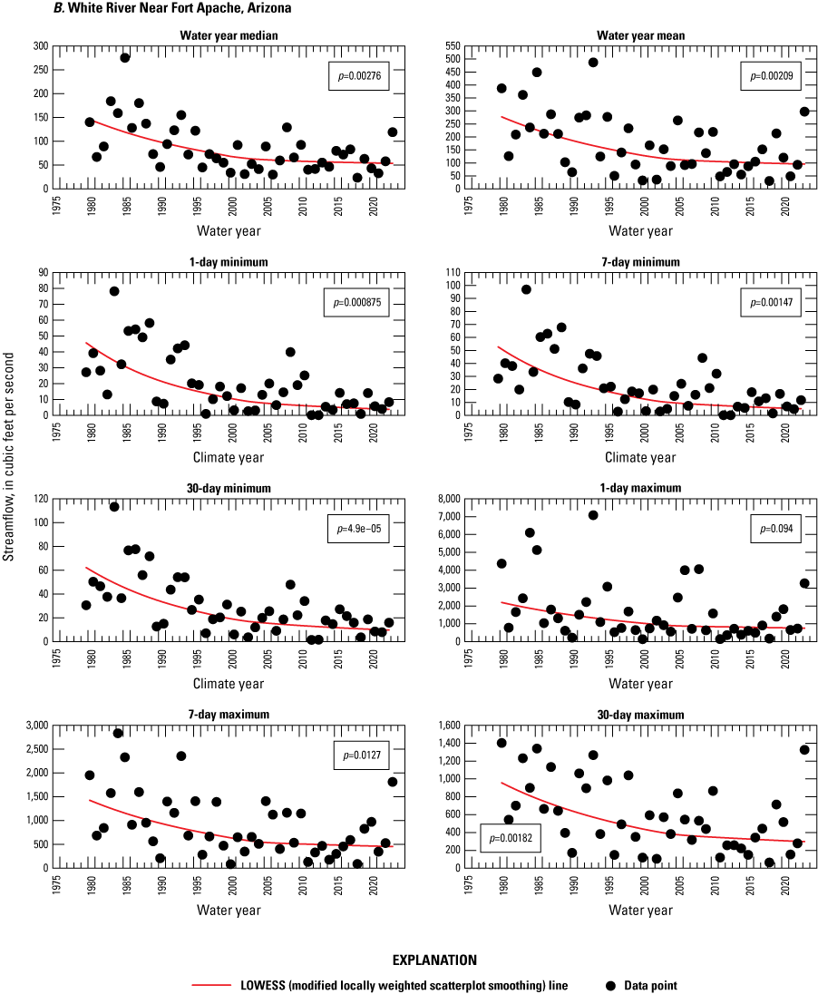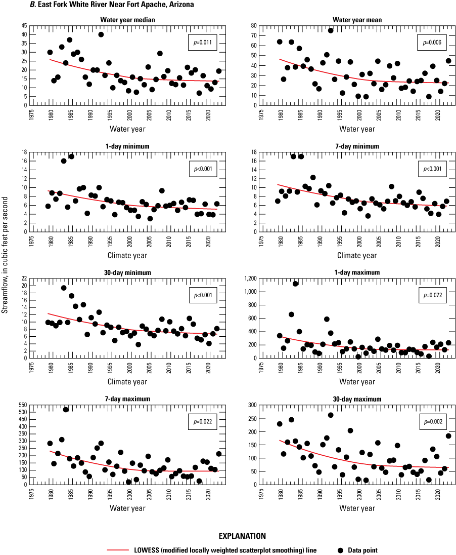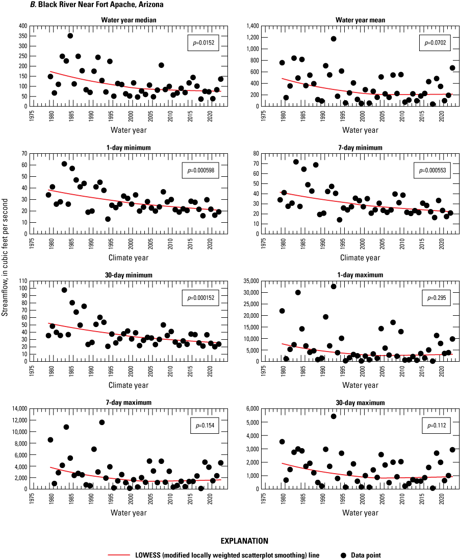 Streamflow data from six U.S. Geological Survey streamgages on the Fort Apache Reservation were analyzed for trends. For most streamflow gages, statistically significant trends were not determined for tested parameters when the entire streamflow period of record was used for stations with records going back to at least the 1960s. However, when the data from 1980 to 2023 was tested, most of the streamflow parameters had statistically significant negative trends. All six streamgages showed a decrease in average annual runoff of at least 50 percent from 1980 to 2023; one streamgage showed an 81.8 percent decrease.