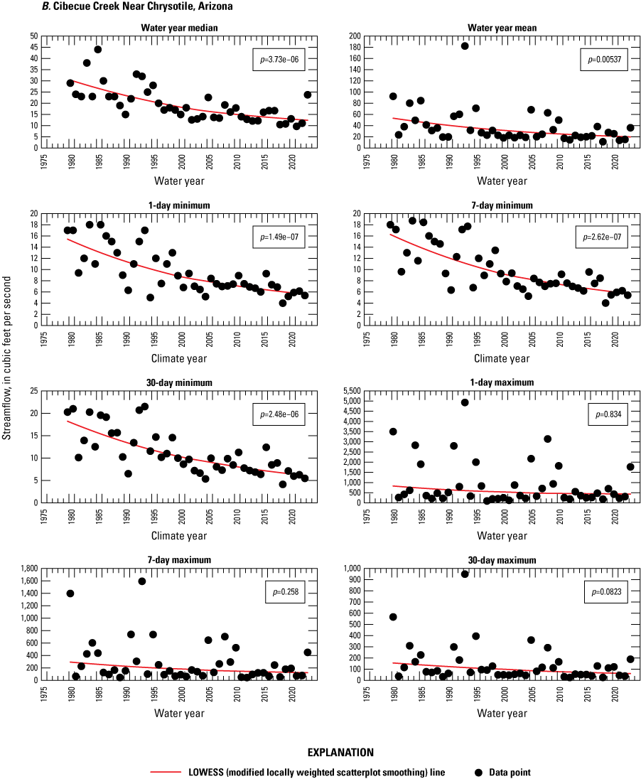 The main reason for selecting this period is that the temperature dataset used in the study has two distinct trends for mean annual air temperature; a breakpoint between the two trends happened in the late 1970s. The timing of this breakpoint coincides with a known shift in the rate of change of air temperatures for the continental United States (Meehl and others, 2016; Vose and others, 2017; U.S. Environmental Protection Agency, 2025). Streamflow trends showed inflection points in the late 1980s when data were analyzed for the entire period of record. For these reasons, the trend analyses of a variety of climate metrics from 1980 to 2023 were used to test whether the rate of change on the Fort Apache Reservation was also stronger than that for the preceding decades. Trends identified from 1980 to 2023 may be part of natural climatic oscillations and not part of a long-term change in climate. However, because the purpose of this study is to specifically look at the change in climate during the lifetime of the current population living on the Fort Apache Reservation, the 1980 to 2023 period is important. If datasets extended back to the 1930s or earlier, the period from the beginning of their relevant records to 1979 was analyzed for trends. Again, trends seen during these periods may be part of natural climatic oscillations and not part of a long-term change in climate, but nonetheless affected the current population, either directly or because of ecological responses.