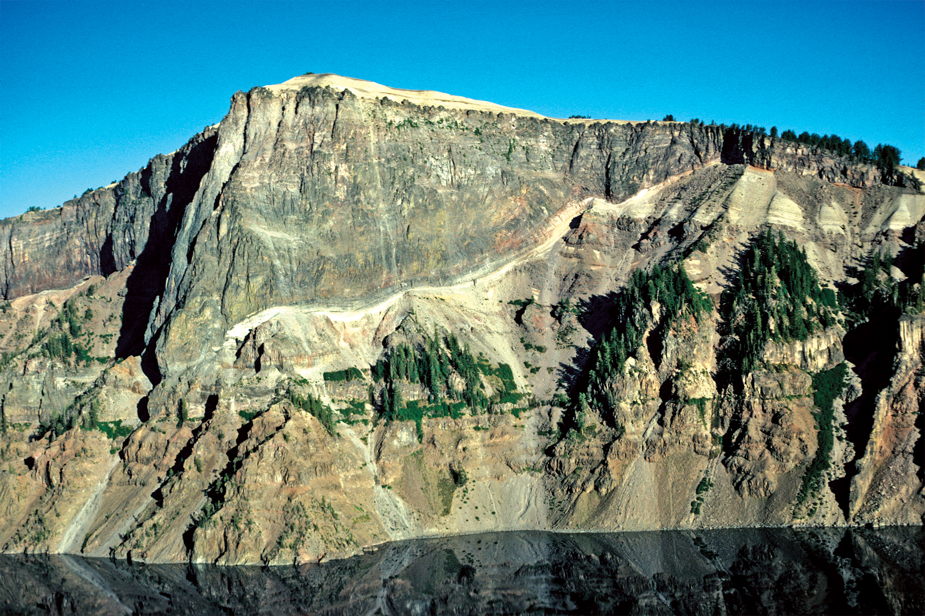 ![]() West of Llao 18. Aerial view to west-southwest of Llao Rock from Steel Bay (Panorama E). Note the thick, light-colored wedge of bedded, near-vent pumice-fall deposit (unit rhp) under the right extent of the Llao Rock lava flow (unit rh). Pumice-fall deposit decreases in thickness to east and also is present lining the explosion crater under the Llao Rock lava flow, where it has been compacted and fused to form dark, dense vitric tuff for several meters thickness against the overlying lava. Two dikes can be traced upward into dacite of Steel Bay lava (unit dsb; 116±5 ka); the more obvious dike stands out from the caldera wall, casting a shadow in the lower right corner of the photo. Photograph by Charles R. Bacon. |