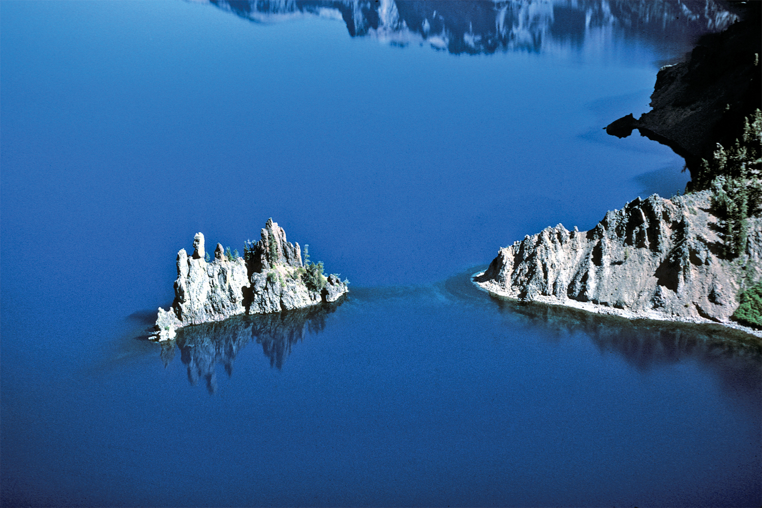![]() Phantom Ship 24. Aerial view of Phantom Ship island and unnamed point in phantom cone (Williams, 1942). All visible rock is lava and breccia of the andesite of phantom cone (unit apn; 403±12 ka here). Phantom Ship tops a buttress on the submerged caldera wall, whose southwest side appears to be bounded by a northwest-trending dike (Bacon and others, 2002). The beach at the point becomes much more extensive at times of low lake level and indicates that the surface elevation of Crater Lake has varied within only a few meters for a considerable time (Bacon and others, 2002). Photograph by Charles R. Bacon. |