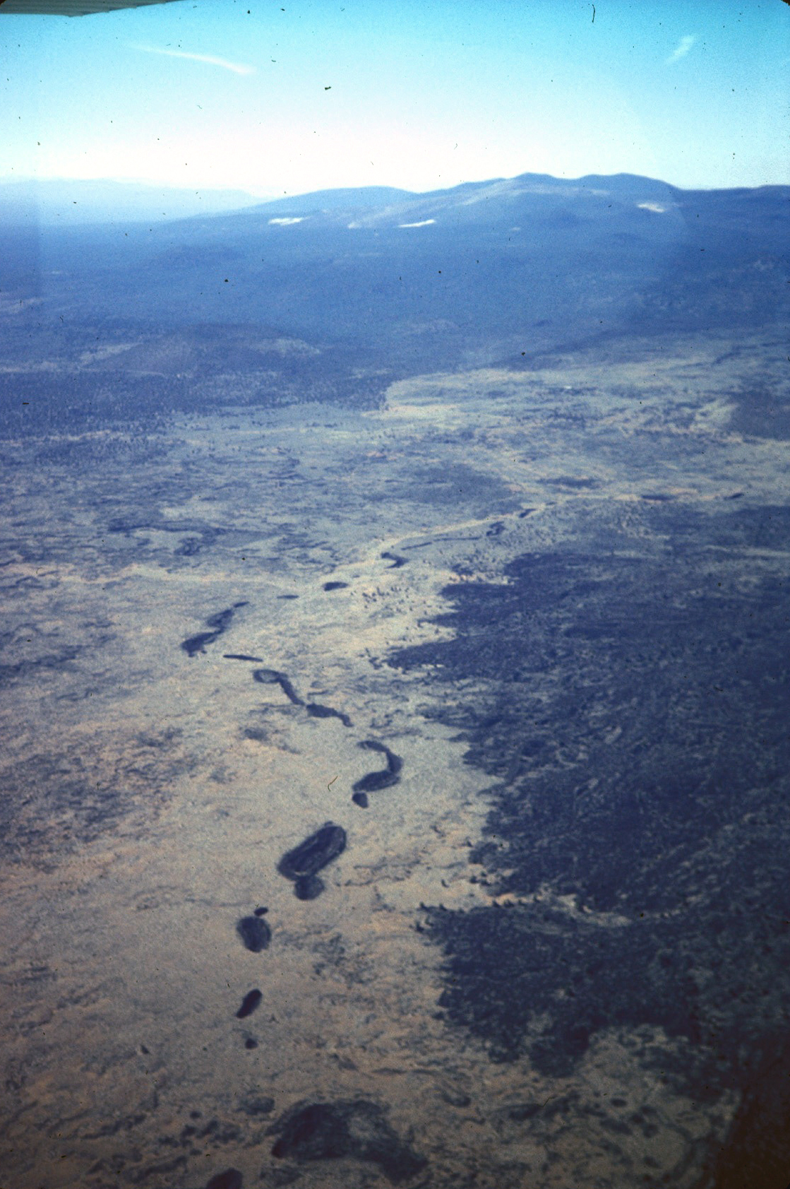 ![]() Lava Tube 18. Aerial view south-southeast across central Lava Beds National Monument displays dark-colored collapse trenches along trace of lava tube that carried lava from Modoc Crater, one of the vents for the basalt of Mammoth Crater, through Skull Cave to the edge of Tule Lake. The basalt of Mammoth Crater (map unit bmc) was erupted about 35,000 years ago, covering about 70 percent of the monument. To the right of the lava tube is the eastern edge of the earlier Schonchin Flow, which was vented from the base of Schonchin Butte about 65,000 years ago. The Schonchin Flow and Schonchin Butte make up map unit asb. Photograph by Julie M. Donnelly-Nolan. |