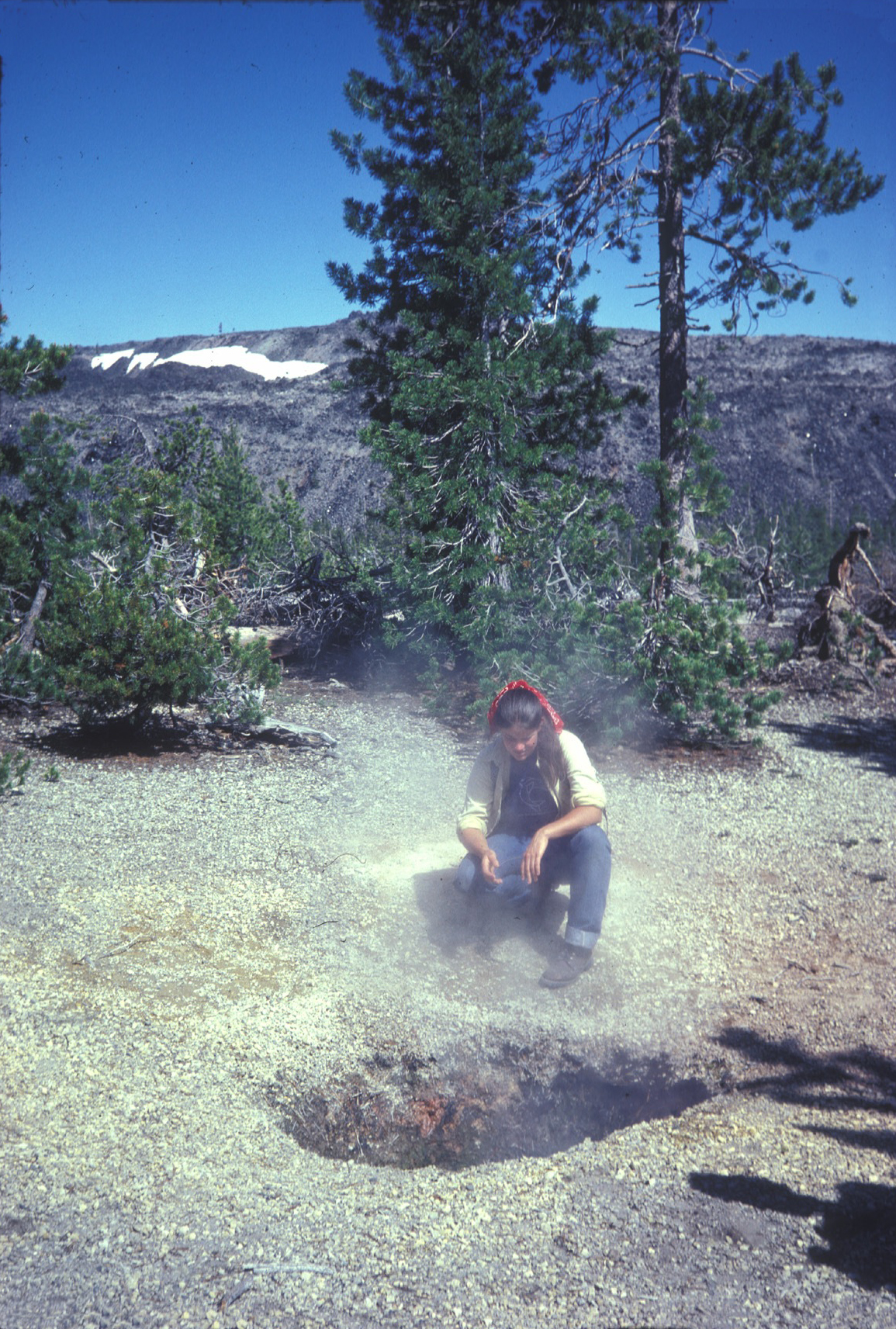 ![]() The Hot Spot 20. Steam emerges from The Hot Spot, the single active fumarole at Medicine Lake volcano. The margin of the Glass Mountain rhyolite flow of map unit rgm can be seen to the southeast in the background. Photograph by Julie M. Donnelly-Nolan. |