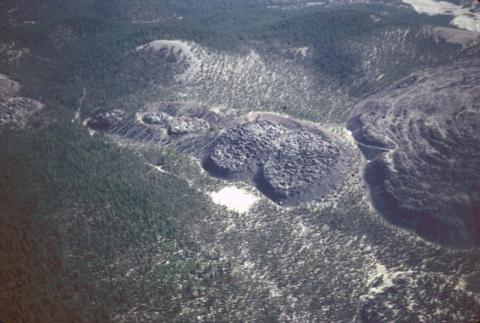 ![]() Drill Pad and Domes 23. White spot in center of photograph is former drill pad for test well drilled as part of exploration for geothermal energy at Medicine Lake volcano. Northern edge of Glass Mountain flow is seen at right; small domes to north (left) are "domes 1 through 5" then a gap occupied by the road to the drill pad, then "domes 6 through 8" of the Glass Mountain fissure eruption (map unit rgm) at the left margin of the photograph. Photograph by Julie M. Donnelly-Nolan. |