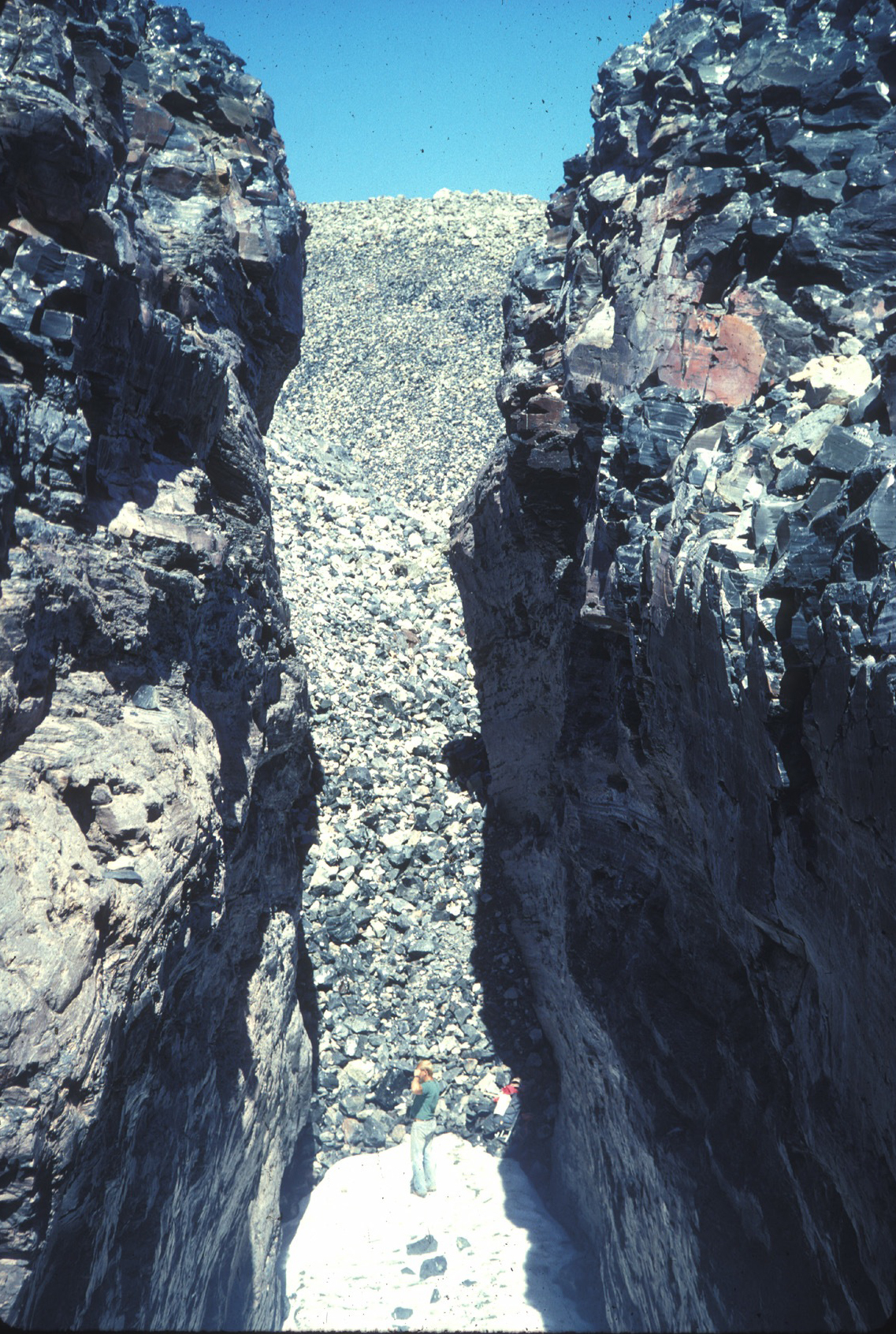 ![]() Deep Crack 29. Deep crack near center of Glass Mountain rhyolite flow of map unit rgm is located where the lava flow transitioned from moving across gentle topography to moving steeply downhill to the east (to right). Person standing on snow gives scale. Photograph by Julie M. Donnelly-Nolan. |